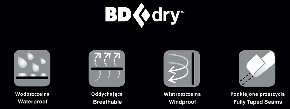 BD.dry - wodoodporna technologia Black Diamond stosowana w obuwiu i odzieży technicznej. Materiały BD.dry są lekkie, elastyczne i w pełni odporne na wodę. Dodatkowo odzież posiada podklejone przeszycia, a wierzchnia warstwa materiału jest impregnowana.