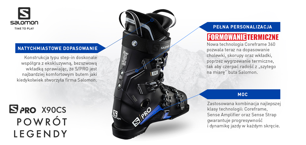 Dzięki nowej ramie COREFRAME 360 zastosowanej w bucie S/PRO można spersonalizować jego trzy elementy skorupę, cholewkę i but wewnętrzny tak by wszystkie elementy idealnie pasowały do Twojej stopy. Przeprojektowana konstrukcja oraz bezszwowy but wewnętrzny modelu S/PRO sprawią, że jest to najwygodniejszy i najprostszy w zakładaniu but narciarski jaki dotychczas stworzyła marka Salomon.