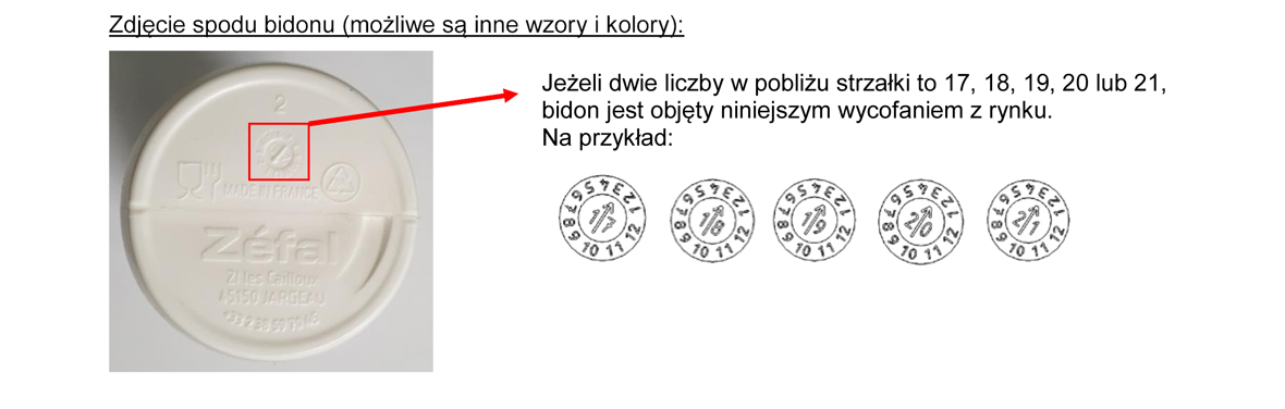 Firma ZEFAL SA („ZEFAL”) stwierdziła, że niektóre dziecięce bidony rowerowe ZEFAL nie spełniają wysokich standardów jakości i bezpieczeństwa ZEFAL. Z przeprowadzonych testów wynika, że w rzadkich przypadkach wysuwany zawór może odczepić się zbyt łatwo. Jeżeli zawór odczepi się podczas picia, istnieje ryzyko zadławienia. Dotychczas firma ZEFAL nie otrzymała zgłoszeń o incydentach ani przypadkach odczepienia się zaworów. Niemniej jednak ponieważ bidony były przeznaczone specjalnie dla dzieci, firma ZEFAL postanowiła dobrowolnie wycofać je z rynku, kierując się szczególną ostrożnością. Bidony były sprzedawane w okresie od stycznia 2017 r. do stycznia 2022 r. w różnych wzorach i kolorach. Wszystkie przedmiotowe modele są oznaczone marką „ZEFAL” na spodzie bidonu i można je łatwo rozpoznać jako bidony dziecięce, ponieważ mają jedynie 158 mm wysokości i 350 ml pojemności.